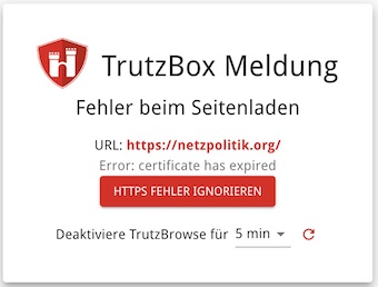 Bis wir dieses Update verteilen können, können Sie sich behelfen, indem Sie für solche Seiten TrutzBrowse ausschalten. Oder wenn diese Fehlermeldung erscheint, durch drücken des roten Knopfs „HTTPS FEHLER IGNORIEREN“ der TrutzBox erlauben, dieses Zertifikat als gültig anzuerkennen.