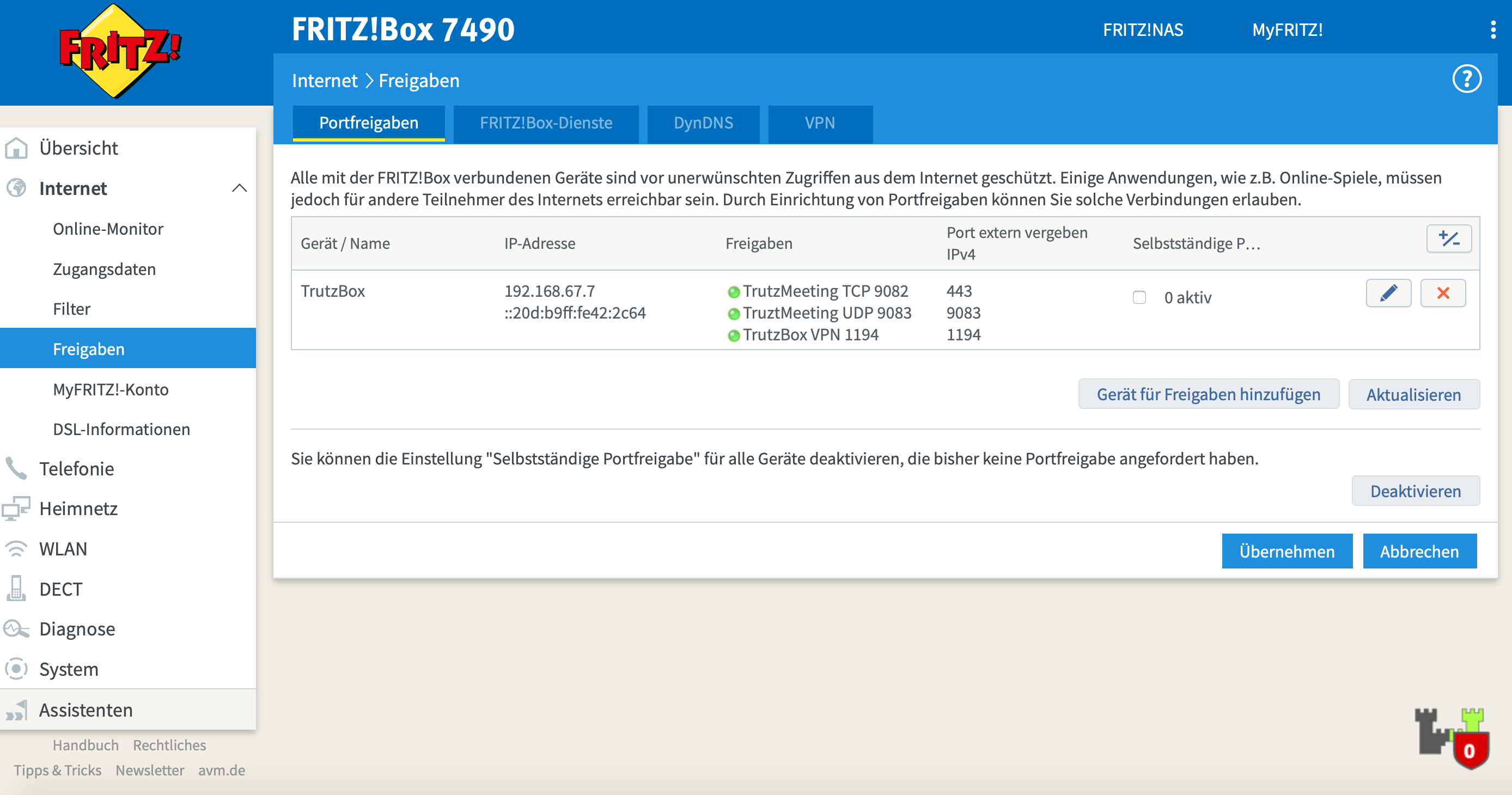 ich habe die Freigaben in der FritzBox erteilt (s. A.).
