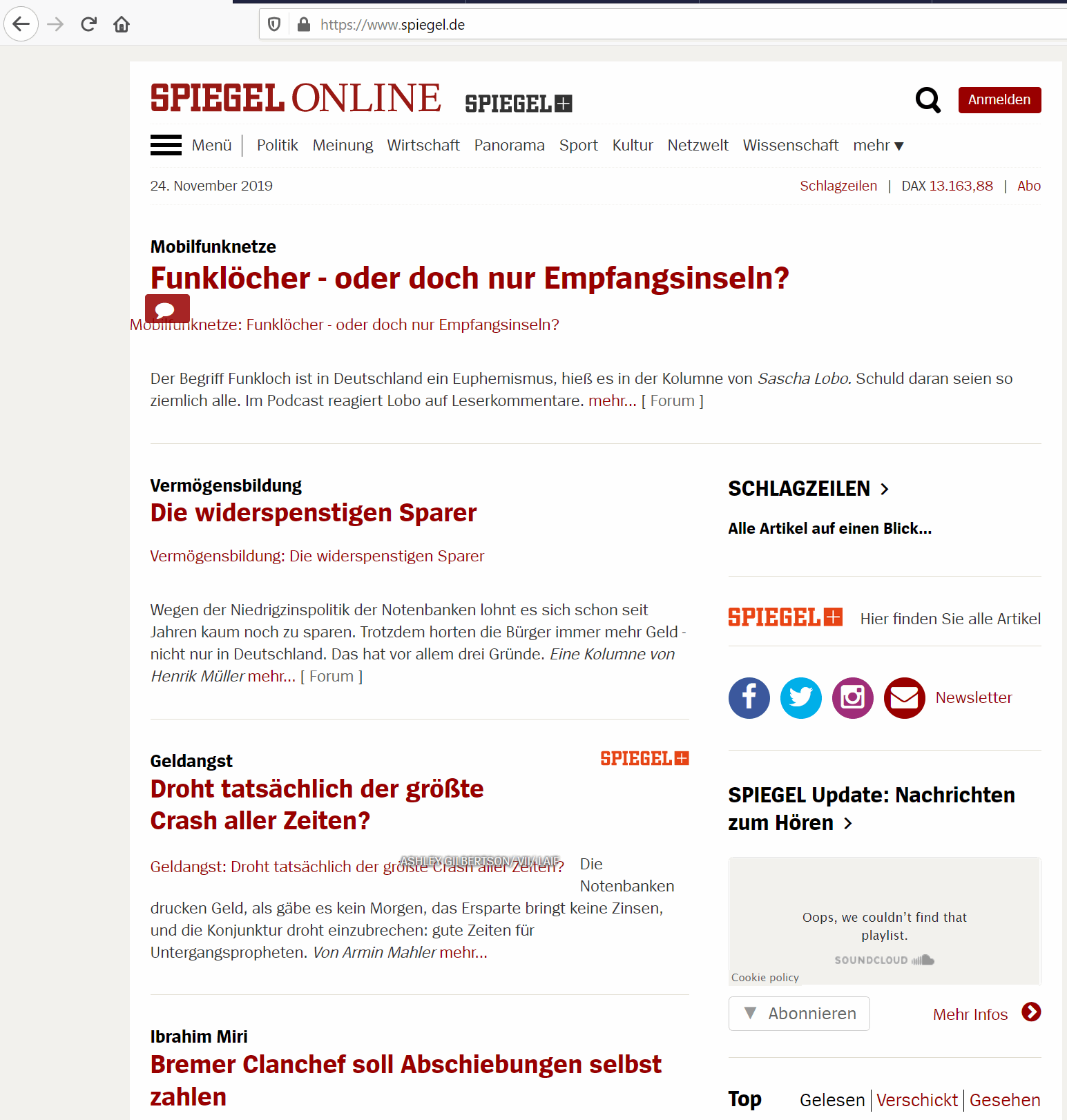 Die einzige mir bekannte Ausnahme ist bisher www.spiegel.de. Diese wird trotz der Slider Einstellung "10" nicht korrekt angezeigt. Hier fehlen die Bilder vollständig und die Texte werden durch Icons bzw. andere Texte teilweise überlagert.