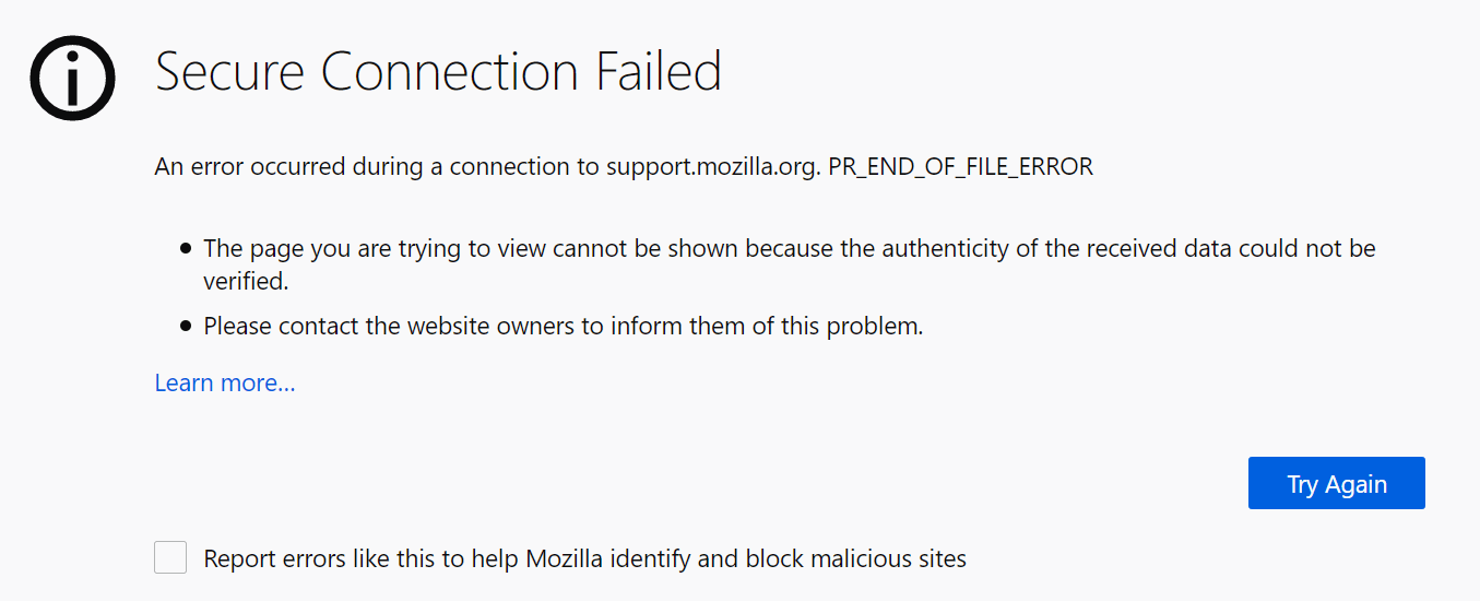 An error occurred during a connection to support.mozilla.org. PR_END_OF_FILE_ERROR