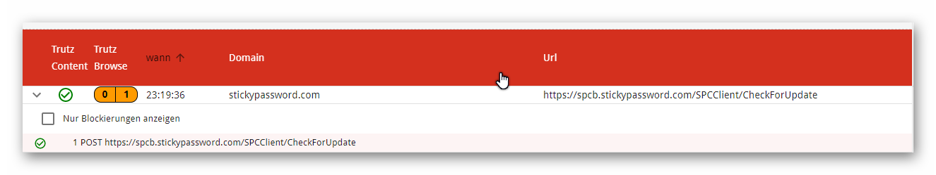 Es geht um die Software "Sticky Password" damit ich mich anmelden konnte musste ich den Slider auf 6 stellen. Das hat funktioniert. Als ich auf Update suche ging wurde mir angezeigt alles sei aktuell, ich habe auch nicht gesehen das etwas blockiert wurde. Ich wusste aber von der Webseite das es ein neues Update gibt. Ich schaltete die Verbindung zur Trutzbox ab und da wurde das Update erkannt.