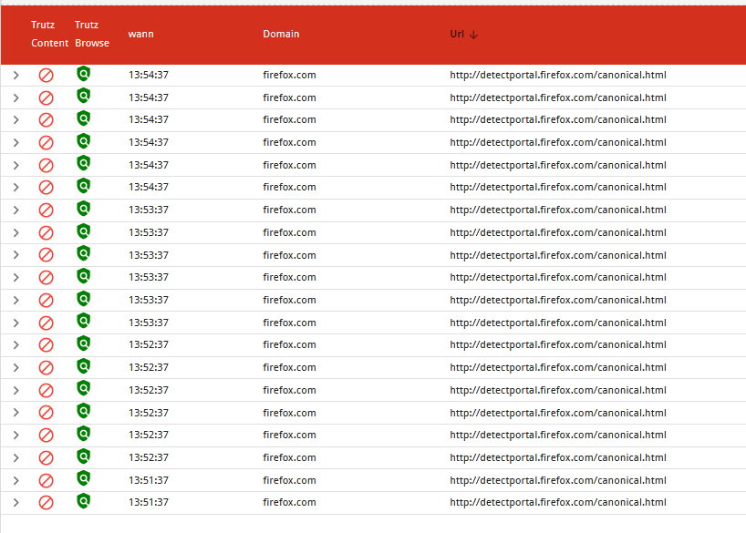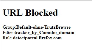 "http://detectportal.firefox.com/canonical.html" erzeugt. Ursache für die Blockung scheint ein Eintrag im Filter "tracker_by_Comidio_domain" zu sein.