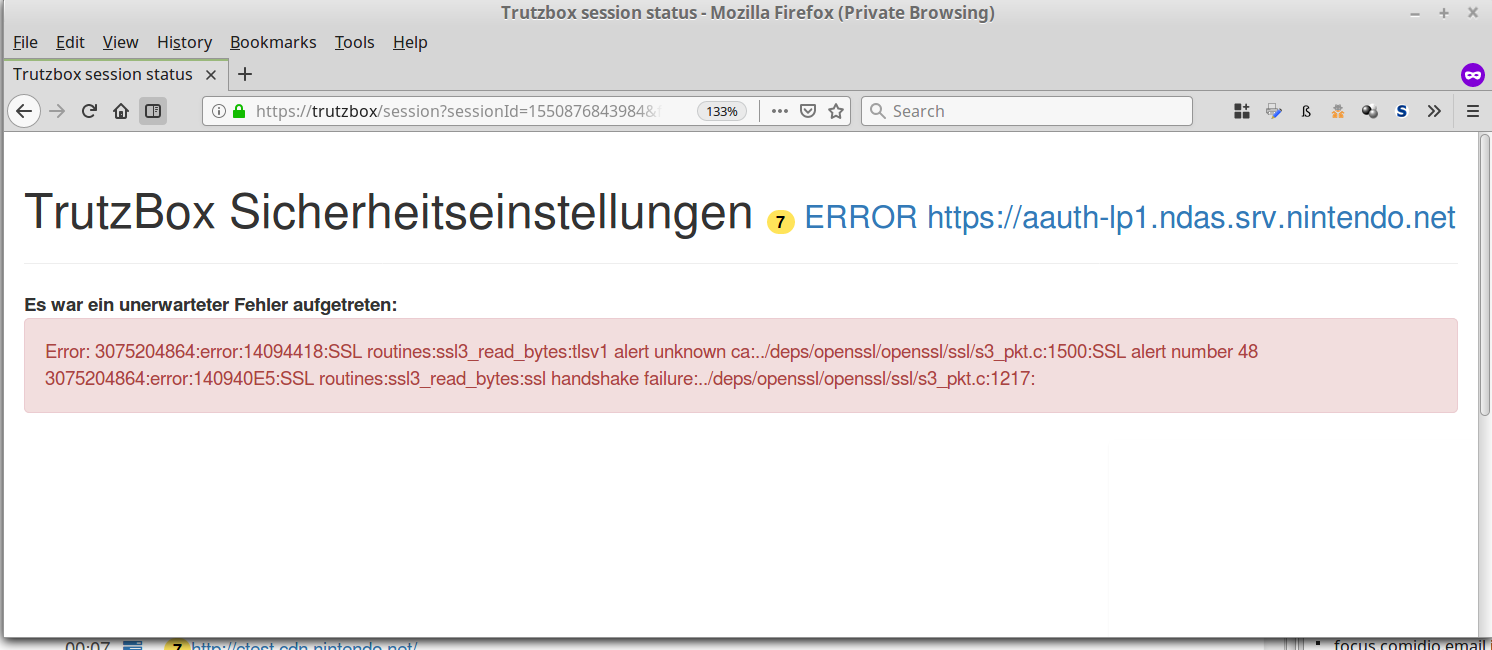 Nachdem ich in den "Slider Einstellungen" einen neuen Eintrag für *.nintendo.net auf SecLevel 7 vorgenommen habe, kommt nun eine neue Fehlermeldung über ein SSL-Handshake-Problem.